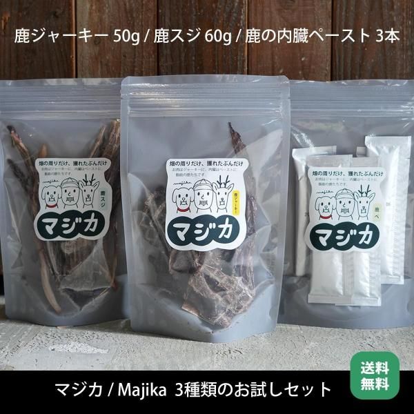 【マジカ / majika】送料無料 数量限定 お試しセット 鹿肉ジャーキー 50g / 鹿スジ 60g / 鹿の内臓ペースト 15g×3本